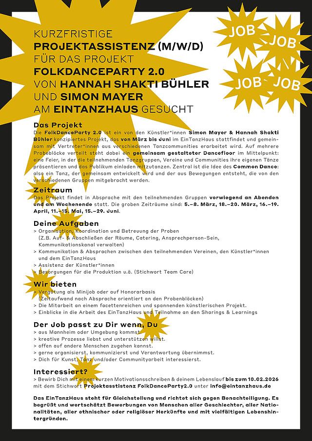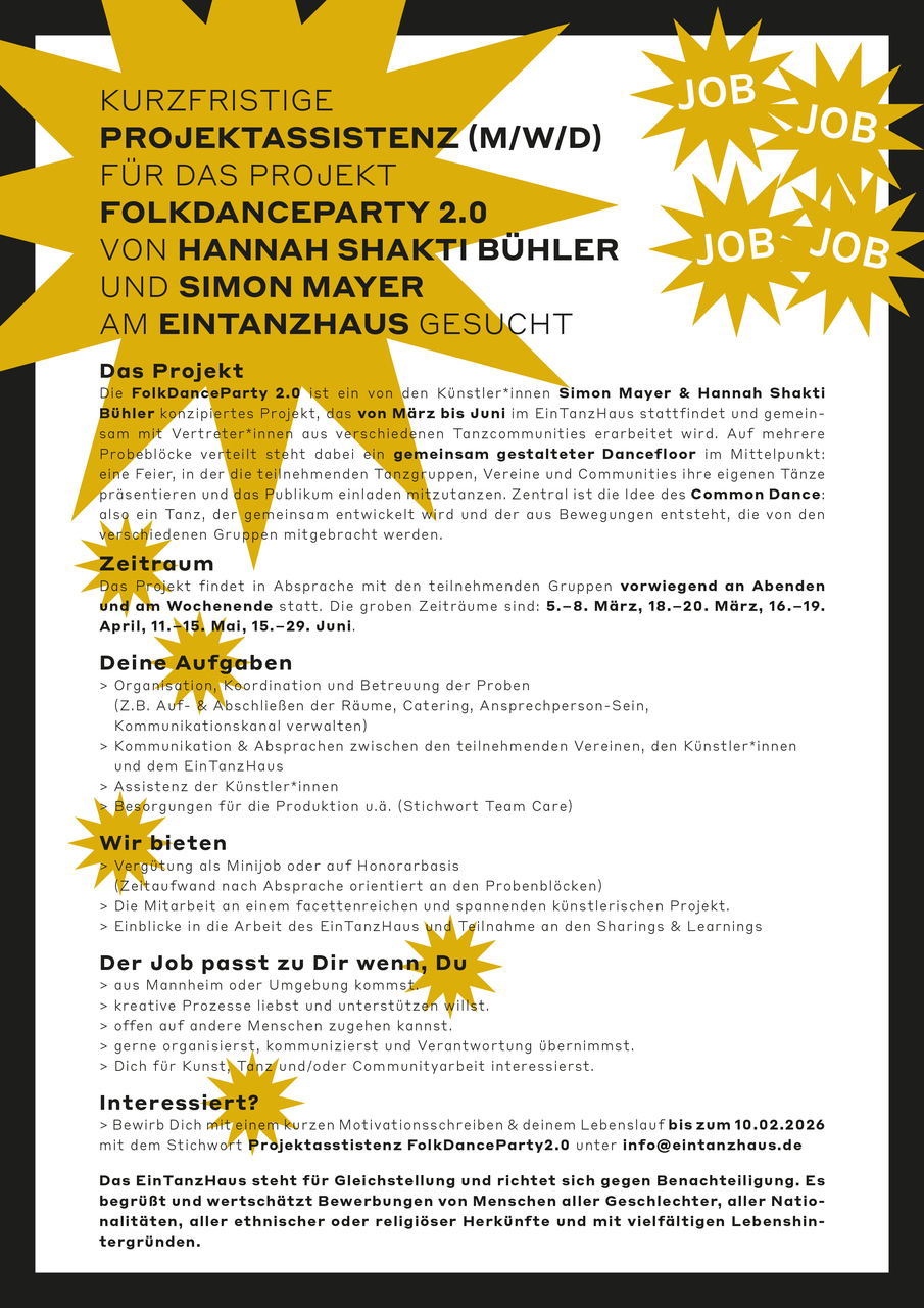 Interessiert? > Bewirb Dich mit einem kurzen Motivationsschreiben & deinem Lebenslauf bis zum 10.02.2026 mit dem Stichwort Projektasstistenz FolkDanceParty2.0 unter info@eintanzhaus.de