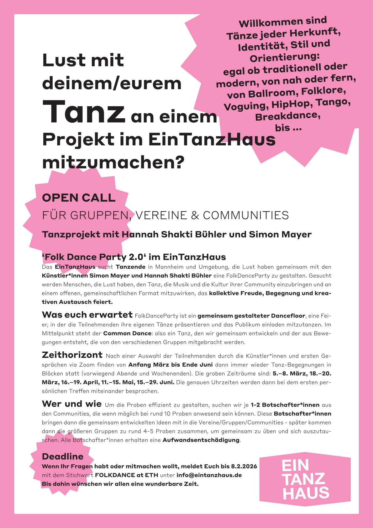 mit dem Stichwort FOLKDANCE at ETH unter info[at]eintanzhaus.de